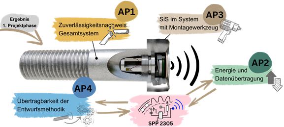 Standardisierte Maschinenelemente eignen sich ideal zur Erfassung relevanter Prozessdaten. Schrauben sind als Verbindungselemente besonders geeignet, da sie im Kraftfluss liegen. Im DFG-Schwerpunktprogramm 2305 entwickelt das Teilprojekt SiSmaK eine Schraube mit integrierter, mehraxialer Kraftmessung und vollständig integrierter Elektronik für autonomen Betrieb. Abgeleitet wird zudem eine Methodik zur Sensorintegration in zylindrische Maschinenelemente. Ziel ist der Nachweis der Funktionszuverlässigkeit über die gesamte Lebensdauer. Dazu werden Kalibriermethoden für große Arbeitsbereiche und standardisierte Tests unter realistischen Umgebungsbedingungen entwickelt. Relevante Umweltbedingungen und Anforderungen werden identifiziert und in standardisierbare Tests überführt. Mechanische Schnittstellen bleiben erhalten. Robustheit wird durch vollständige Verkapselung sichergestellt. Energie- und Datenübertragung erfolgen durch Stahl mittels elektro-magnetischer und akustischer Prinzipien und ermöglichen den autonomen Betrieb. Echtzeit-Lastdaten durch Koppelung der Schraube mit einem Montagewerkzeug ermöglichen optimierte Montageprozesse, verringern Unsicherheiten bei der Vorspannkraft und reduzieren die Überdimensionierung. Im Schwerpunktprogramm wird zudem die Vernetzung verschiedener sensorintegrierender Maschinenelemente in einer IIoT-Struktur untersucht. Die entwickelte Methodik ist auf weitere zylindrische Maschinenelemente übertragbar und umfasst Designraum, Sensorgestaltung, Elektronikintegration sowie Energie- und Datenübertragung.